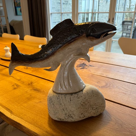.Figuren forestiller en fisk med åbent gab og markerede skæl. Velegnet som dekoration på hylde, reol eller bord. Fremstillet i glaseret keramik. Længde 22 cm. Utrolig flot detaljeret
