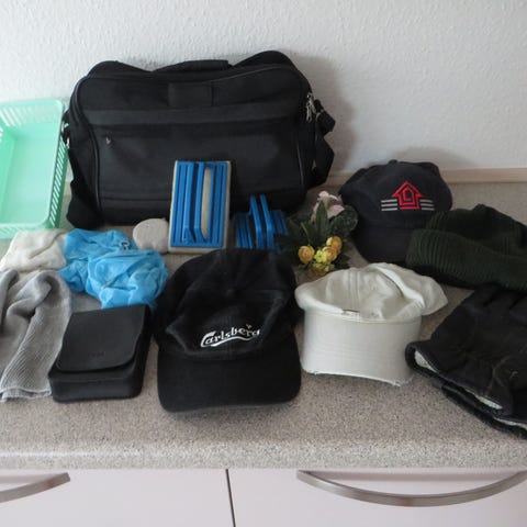 Skuldertaske sort, kasket hvid adidas, kasket sort Carlsberg, kasket sort Bygma, top hue grøn i strik, handsker i læder svineskin sort med hvidt for er nye ikke brugt, plast blomster, sort lille etui. pimpsten, 2 stk håndskrubbere, 1 stk lille plast kurv, 2 stk blå engangs salonhår, 1 par grå sokker med skridsikker sål,