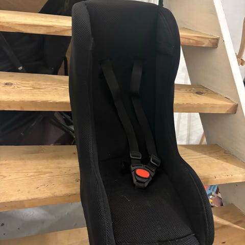 Sædet er polstret med en blød, lys beklædning og har en sort bund. Egnet til børn, designet til at give komfort og støtte ved cykling i ladcykel. Med 3punktsæle