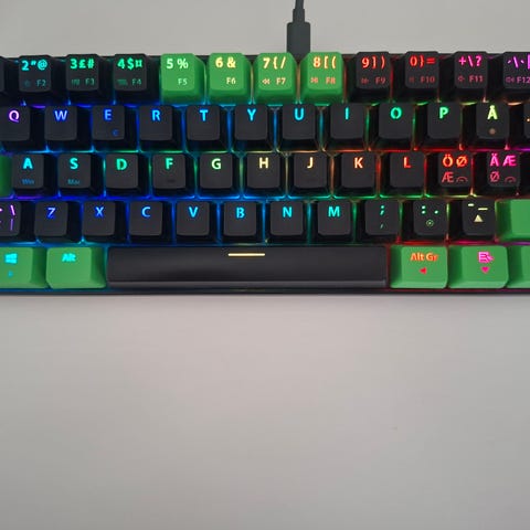 Nox Gaming kompakt tastatur med RGB-belysning i flere farver. Tastaturet er i sort og tilsluttes via USB 2.0 kabel.
