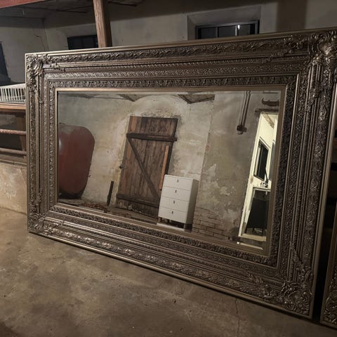 Kæmpe vægspejl (80x142-144) med buet top og sort metalramme. Lavet af et tidligere staldvindue. Ikke Ikea, men der skal vælges et mærke.