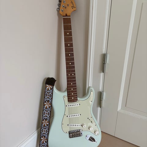 Mexico strat fra 2010, der er i perfekt stand bortset fra en enkelt revne i lakken (og kun i lakken!), som jeg har fyldt lim i og slebet — den er ikke voldsomt køn, men nu rykker den sig i hvert fald ikke.