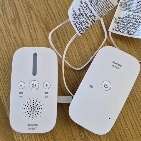 Philips Avent babyalarm i hvid. Sættet består af forældre-enhed med display og betjeningsknapper samt baby-enhed med betjeningsknapper. Medfølgende strømadapter/kabel ses på billederne. Velegnet til lydovervågning af spædbarn eller barn i hjemmet.
