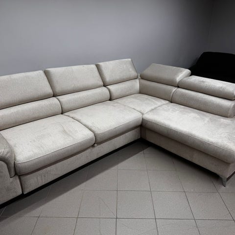 Hjørnesofa med sovefunktion i gråt stof. Sofaen er udformet som en L-formet hjørnesofa med chaiselong i venstre side (set forfra). Ryglæn med tre separate ryghynder og brede armlæn.