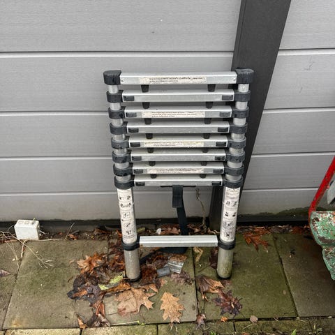 Teleskopstige i aluminium. Stigen kan trækkes ud trin for trin og skubbes sammen igen, så den fylder minimalt ved opbevaring og transport. Udstyret med sikkerhedsmærkater og opfylder EN 131-standarden ifølge mærkningen.