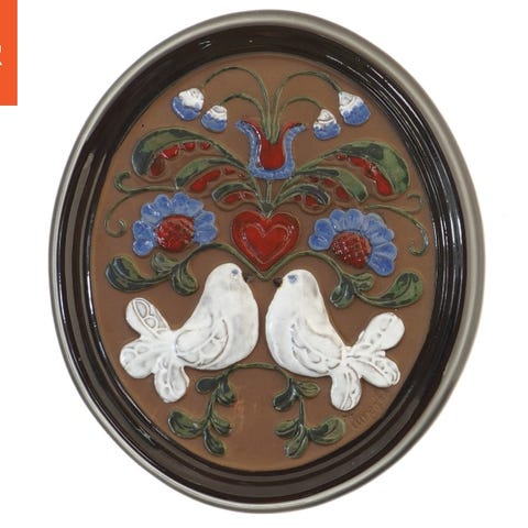 Denne vægdekoration er fremstillet af keramik og har en oval form med målene 17,5x14 cm. Den har en brun base med to farverige fisk relieffer i blå og orange. Bagsiden viser teksten 'Gabriel Sweden Fiskarna A272'. Dekorationen inkluderer en metalkrog til ophæng.