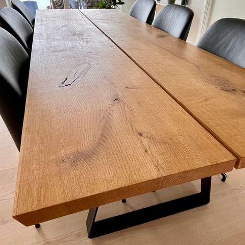 Flot plankebord i mørkebrunt massivt træ, der giver et råt og rustikt look. Bordet har sorte ramme ben af metal. Længde: 200cm. Bredde: 98 cm. Højde: 78 cm. Bordpladen er 4cm tyk.