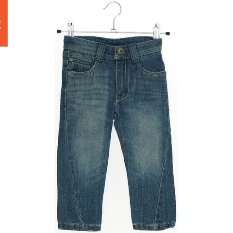 Par blå jeans til børn, med forlommer og baglommer. Bukserne har bæltestropper og lukkes med knap og lynlås.