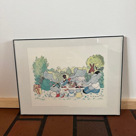 Flot rød Babar plakat i ramme med plexiglas så den er egnet til at hænge på børneværelset.