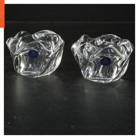 Disse er et par lysestager fremstillet af klart glas, designet med en elegant bølget udseende. De er fra mærket Royal Copenhagen, tydeligt markeret med deres karakteristiske blå mærke. Lysestagerne er cirkulære og måler 10,5 cm i diameter. De er beregnet til at holde stearinlys og kan være en dekorativ tilføjelse til ethvert rum i hjemmet.