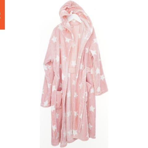 Badekåbe til børn i lyserød farve med guldfarvede hjertemønstre. Kåben har to forlommer og et bindebælte. Den er lavet af blødt materiale for komfort.