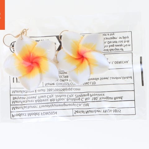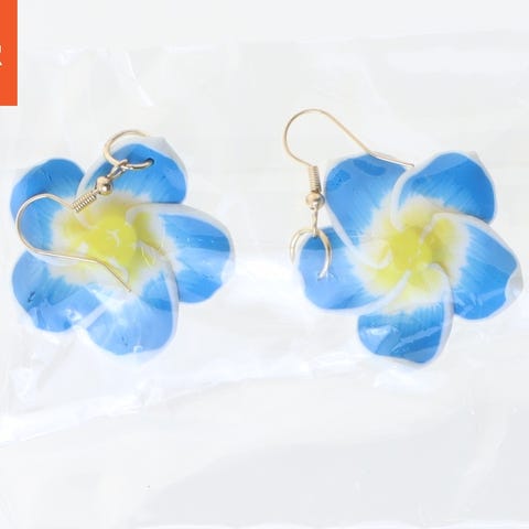 Disse er et par blomsterformede øreringe lavet af polymermateriale. De er blå med hvid detaljer ved blomstens centrum. Øreringene er hver 5 cm i diameter og har metal kroge til at sikre dem til øret. Der er en dekorativ sten i midten, som udgør et både praktisk og æstetisk element. Disse øreringe er lette og velegnet til at komplementere forskellige outfitstile.