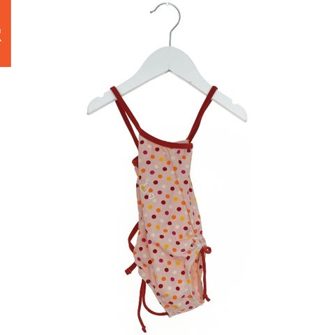 Badedragt med tynde stropper og blomsterprint i kontrastfarver. Dragtens kant og stropper er blå, og den har et flæse-detalje rundt om taljen og en lille sløjfe foran. str 74