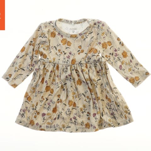 Kjolen har et blomstret design med store florale mønstre i beige, blå, grønne og hvide nuancer. Den har korte ærmer og elastisk talje, hvilket giver en lettere løs pasform. Materialet ser let og luftigt ud, perfekt til sommerbrug.
