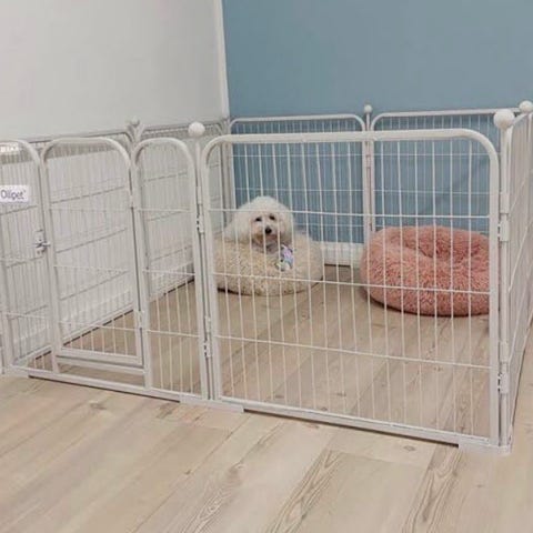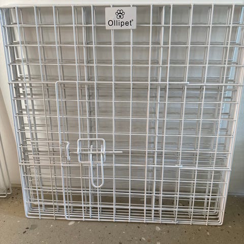 Ollipet hundegård i hvidlakeret metal. Består af flere sammenhængende sektioner med tremmer og låge, der kan bruges som indendørs afskærmning eller løbegård til hund. Velegnet til at afgrænse et område i hjemmet, fx omkring hundekurv eller som hvalpegård. Farve: hvid. Materiale: metal.