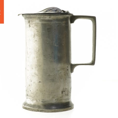 Denne vintage keramik kande har en unik konisk form med håndtag. Den har et mønstret design med geometriske former, der er farvet i klassiske sorte og røde nuancer med guldkanter. Kanden har en ru overflade og er ideel til dekoration eller som en funktionel serveringsgenstand. Dimensionerne er 31x9 cm.