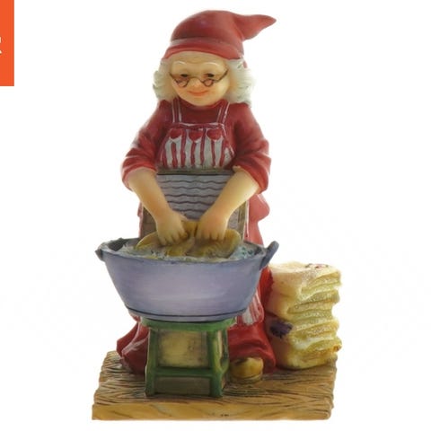 Figur af en nisse i keramik, klædt i en rød jakke, grønne bukser og gult støvler. Figuren står ved siden af en træagtig skænk med en stribet klud og en lille potteplante på toppen. Nissen holder en gul genstand med et hjerte på. Figuren har målene 11x5x5 cm. Tags: nisse, juledekoration, keramik