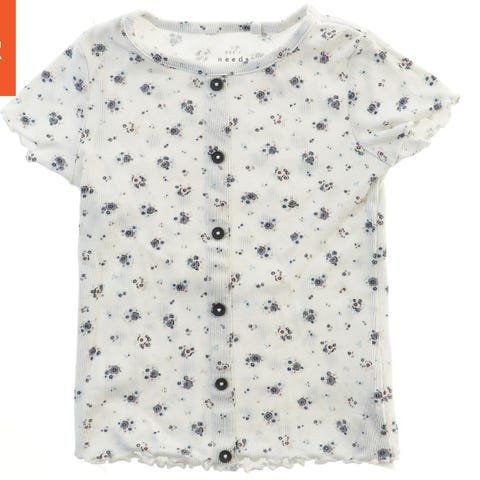 Sættet består af en bluse og en nederdel. Blusen har en elastisk krave og korte flæseærmer. Nederdelen har en elastisk talje og er lidt længere bagtil. Begge dele er hvide med et mønster bestående af små farvede blomster i orange, blå og brun.