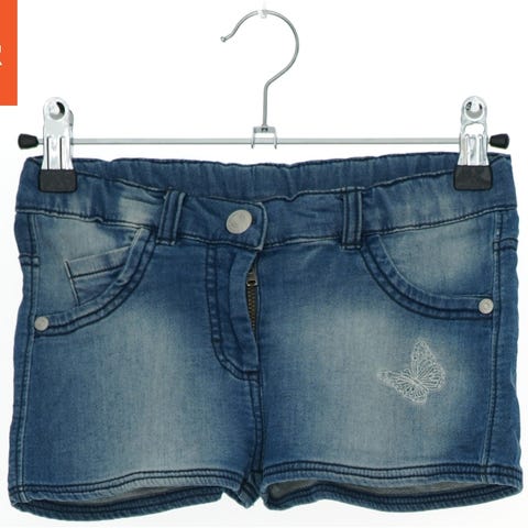Blå denim shorts til børn, med forskudt mønster og elastik i taljen. Foran er der en lynlås og en knaplukning samt to lommer. På bagsiden findes også to lommer. På det ene ben foran er der et sommerfuglemotiv.