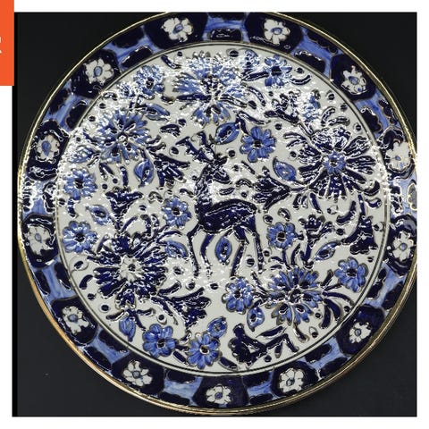 Dekorativ tallerken med et farverigt mønster. Tallerkenen har en diameter på 31 cm og er prydet med et blomstermotiv i blå, grøn, og brune nuancer. Bagsiden af tallerkenen er lys med små blå pletter og en metalring til ophæng.
