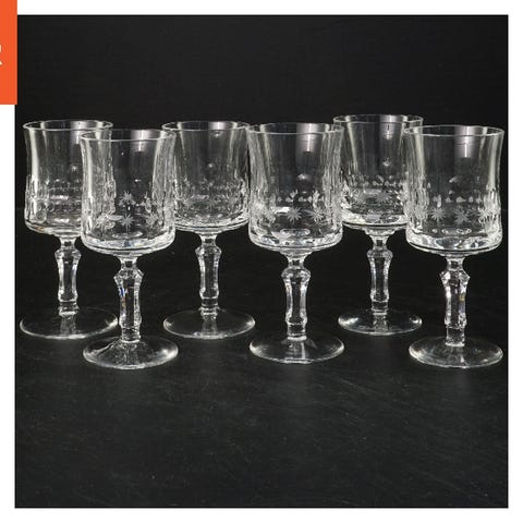 Dette er et sæt af firekrystal glas, hver med en særpræget indgravering af stjernemønster på overfladen. Glassene har en klassisk form med en bred kant og står på en robust fod. De måler hver 14,5 cm i højden og 6,5 cm i diameter. Disse glas er passende til servering af diverse drikkevarer og tilføjer en elegant touch til borddækningen. Deres klare glasdesign gør dem alsidige og brugbare til mange lejligheder.
