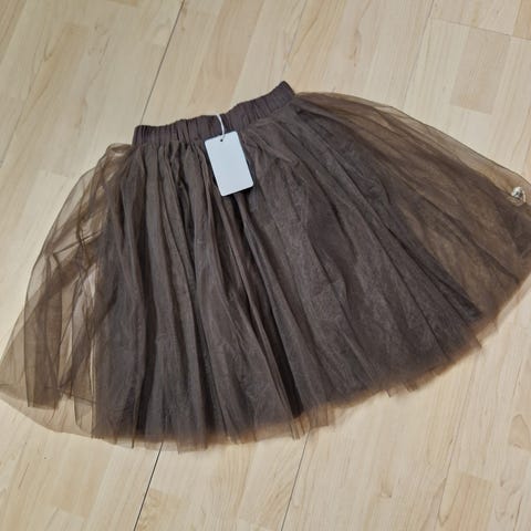 En grå nederdel med små sorte prikker. Nederdelen har en elastisk talje med en snor. Materialet ser blødt ud, og der er ingen synlige lynlåse eller lommer.