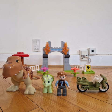 Udover brochuren som du kan se på billedet hører der også andre små brochurer og klodser med i posen til at bygge endnu flere dinosaurere.