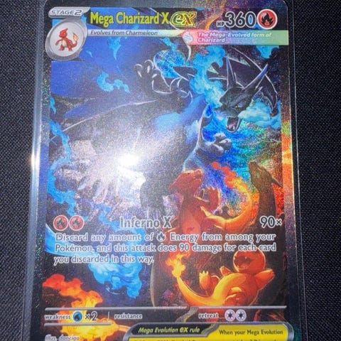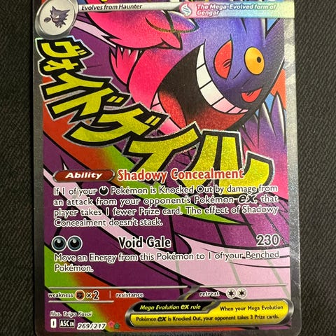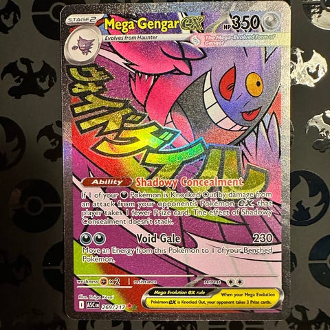 Pokémon Mega Gengar EX samlekort fra Ascended Heroes. Kortet viser Mega Gengar EX med 220 HP og angrebstekster på engelsk. Standard Pokémon-kortstørrelse, opbevaret i plastlomme på billederne. Velegnet til samling eller som spillekort i Pokémon Trading Card Game.