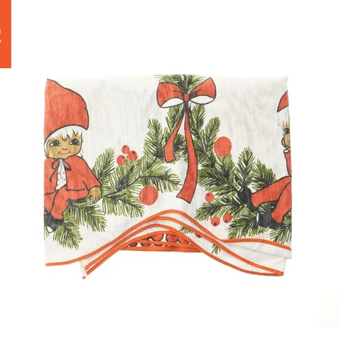 Dette er et juletekstil med et vintermotiv, der viser nisser i en skovscene. Tekstilet er primært hvidt med farverige illustrationer i rød, grøn og gul af nisser, skove og fugle. Det måler 156x50 cm og kan anvendes som et julebanner, viskestykke eller en dekorativ dug. sy en kjole eller lign