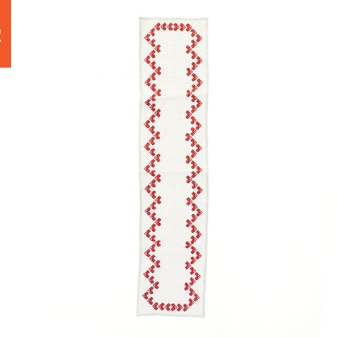 En bordløber med målene 54x24 cm. Den har et broderet mønster med blomster og firkanter. Farven er en mild gul med flerfarvede broderier. Materialet ser ud til at være tekstil, og kan bruges til at dekorere bordoverflader som en del af boligindretning.