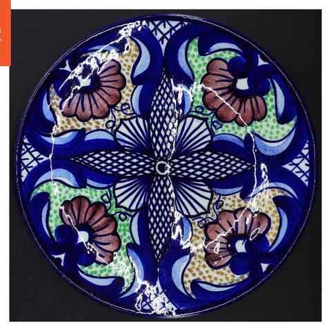 Denne dekorative tallerken har et håndmalet design med en citron og grønne blade på en blå baggrund. Tallerkenen er rund med en diameter på 12 cm og har en gul kant. Den er fremstillet i Spanien, som angivet på bunden af tallerkenen.
