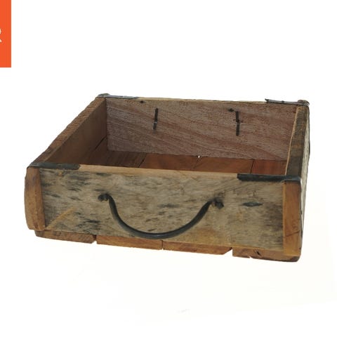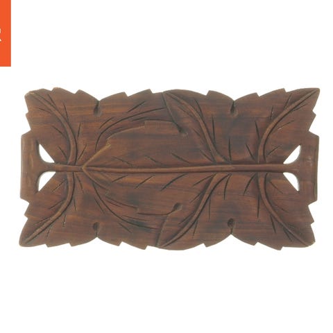 Træbakke med håndtag i begge ender og gittermønster i bunden. Bakken er rektangulær og måler 49x29x5 cm. Den har en naturlig træfarve og er ideel til servering eller dekoration.