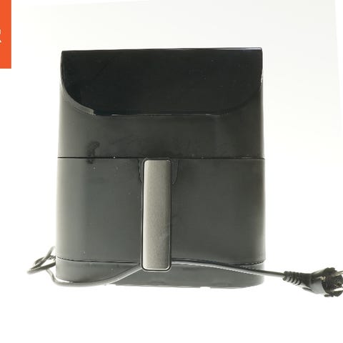 Luftfrituregryde med en sort og sølvfarve, som bruger varm luft til at tilberede mad. Den har en drejeknap for tidsindstilling og en anden for temperaturjustering. Den leveres med en aftagelig kurv til madlavning. Størrelsen på luftfrituregryden er 32 cm.