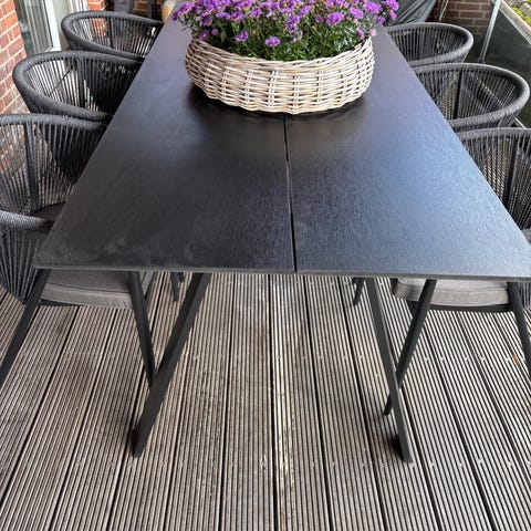 Rektangulært havebord i sort. Bordet har slankt stel og bordplade i mørk finish, velegnet til udendørs brug på terrasse eller altan. Der er plads til flere stole omkring bordet, så det kan bruges til spisning eller ophold udendørs.