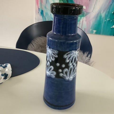 Denne vase fra w. germany er lavet af hvid keramik og har et unikt ansigtsmotiv i relief på ydersiden. Vasen har en rund åbning øverst og er designet i en dekorativ form, der minder om en stiliseret figur. Den nederste del af vasen er præget med et serienummer 2952B. Vasen måler Ø 9 cm med en længde på 12 cm.