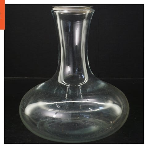 Billedet viser en glaskaraffel fra holmegaard med en høj, slank hals og en bred, rund base. Den er lavet af klart glas og har en størrelse på 25,5 cm. Karaflen er ideel til opbevaring og servering af vine eller andre drikkevarer.