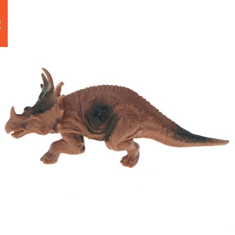 En blød triceratops legetøjsfigur lavet af plys. Den er beige og blå, og designet til at ligne en dinosaur. Figuren har tre horn og en krave, karakteristisk for triceratopsen. Størrelsen er 34 cm, hvilket gør den perfekt til kram og leg. Dette legetøj har et mærke, der ser ud til at komme fra et naturhistorisk museum.
