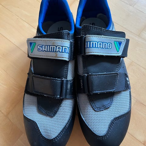 Disse cykelsko er Shimano R099 i størrelse 41, designet til cykling med SPD-SL klamper. De har velcrolukning for en sikker og komfortabel pasform. Den primære farve er lyseblå med sorte og grå detaljer. Sålen er konstrueret med kulfiber og har en rød klampe monteret. Skoene er velegnede til landevejscykling og giver effektiv kraftoverførsel. Tags: cykelsko, Shimano, SPD-SL, cykling.