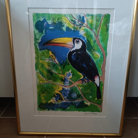 Kjeld Heltoft litografi med tukan fuglemotiv flerfarvet