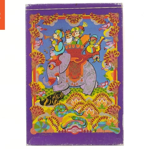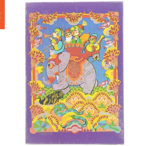 Dette er et puslespil illustreret af Bjørn Wiinblad. Kassen viser en farverig kunstnerisk scene med figurer, sødyr og bjerglandskab. Det åbne puslespilskasse indeholder 500 brikker i forskellige farver og former, som skal samles for at fuldføre billedet. Puslespillet er skabt for Irma og kassen er mærket med relevant information om indhold og format.