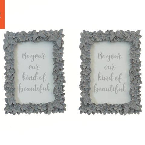 Sættet består af to dekorative billedrammer, hver med dimensionerne 18,5x13,5 cm. Rammerne er udsmykket med blomster- og sommerfuglemønstre i en lys farve og har teksten 'hello gorgeous'. Bagsiden af hver ramme indeholder støtte, der gør det muligt at stille dem op på en flad overflade.