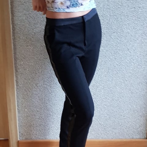 Karl Lagerfeld: Disse sorte bukser er et alsidigt og tidløst stykke tøj, der passer perfekt til både hverdagsbrug og mere formelle anledninger. Bukserne har en klassisk pasform, der smigrer figuren, og de kan nemt styles med forskellige toppe og sko for at skabe et utal af looks. De er et essentielt element i enhver garderobe og kan bruges året rundt. Brugte, alm brugspor, ingen defekter. Mål på billeder. Mid rise, straight fit. US str 12, svarer til XL.