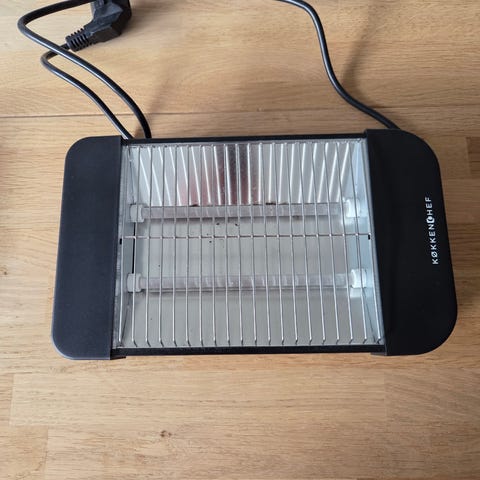 Hvid brødrister. Betjenes med drejeknap på fronten til regulering af varme. Tilsluttes med almindelig ledning.