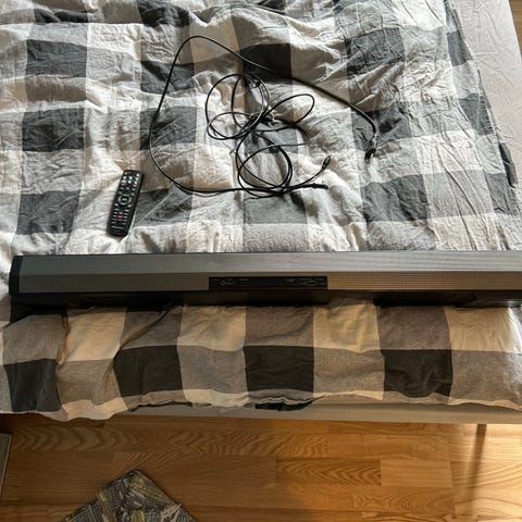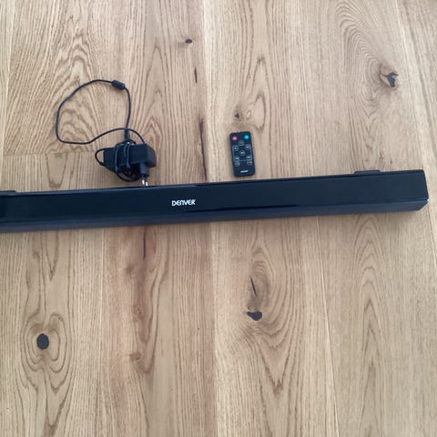Denon soundbar i sort. Den har flere tilslutningsmuligheder på bagsiden, herunder HDMI-indgange, HDMI-udgang (ARC), optisk digital indgang, koaksial digital indgang, netværksport (LAN)
