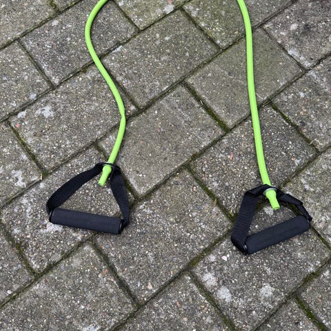 Elastik, Træningselastik - Grøn -, Længde: Ca. 2 m 80 cm. Bredde 15 cm. Købt hos en fysioterapeut, så kvaliteten er i orden. Har været brugt få gange.