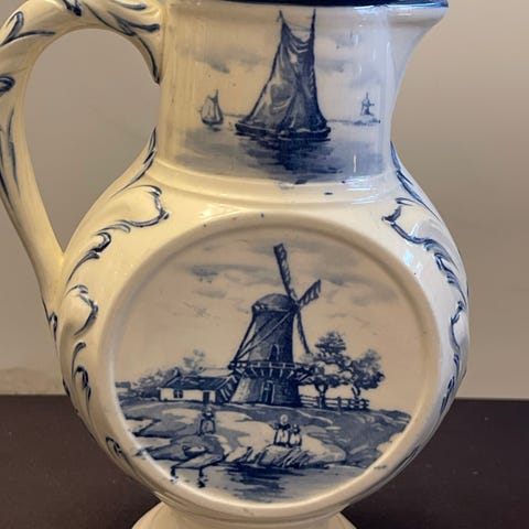 12 kagetallerkner samt to kander. Den ene kande med låg er 22 cm høj inkl. låget, og den anden er 20 cm høj.