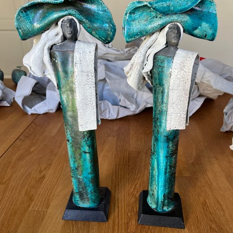 Sæt med to keramikskulpturer i hvidlige nuancer på mørke sokler. Figurerne forestiller stiliserede personer med lange kapper og hovedbeklædning. Overfladen har en rustik, let krakeleret glasur, og detaljerne i ansigter og hænder er udført i en mørkere keramikfarve. Skulpturerne egner sig som dekoration på hylde, reol eller bord i stue, entré eller lignende rum.