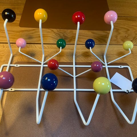 Vitra Hang It All knagerække med hvid metalramme og kugleformede, flerfarvede træknopper. Knagerækken monteres på væg og giver mulighed for ophæng af jakker, tasker og andre genstande i entré, soveværelse eller børneværelse. Designet har flere rækker kroge i forskellige højder, som giver fleksibel opbevaring på begrænset plads.