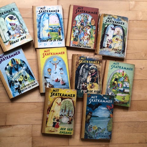 Mit Skatkammer samling børnebøger i 10 bind. Titlerne omfatter blandt andet: "Ride ride ranke", "Fortæl mor", "Der var engang", "Verden er så stor", "Gennem tiderne", "Da de var børn", "Skov, hav og himmel", "Store bedrifter", "Noahs ark" og "Østen for solen vesten for månen". Illustrerede hardback-bøger med røde rygge og farverige forsider. Velegnet som højtlæsningsbøger og oplæsning for børn.