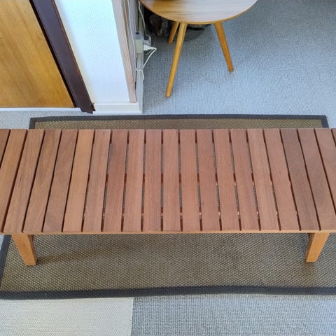 Thuja-stamme, der er udskåret. Længden er ca 170 cm. Langtidstørret køligt indendøre (stald), Kvalitetstræ. Kræver “ben”, slibning og behandling. Stammer fra et stort thuja-træ, vi selv har fældet. Stammen er skåret midt igennem, så dette er "halvdelen". Tyk ende: Bredde 30 cm./ tykkelse 25 cm. Tynd ende: Bredde 20 cm. Tykkelse 10 cm.